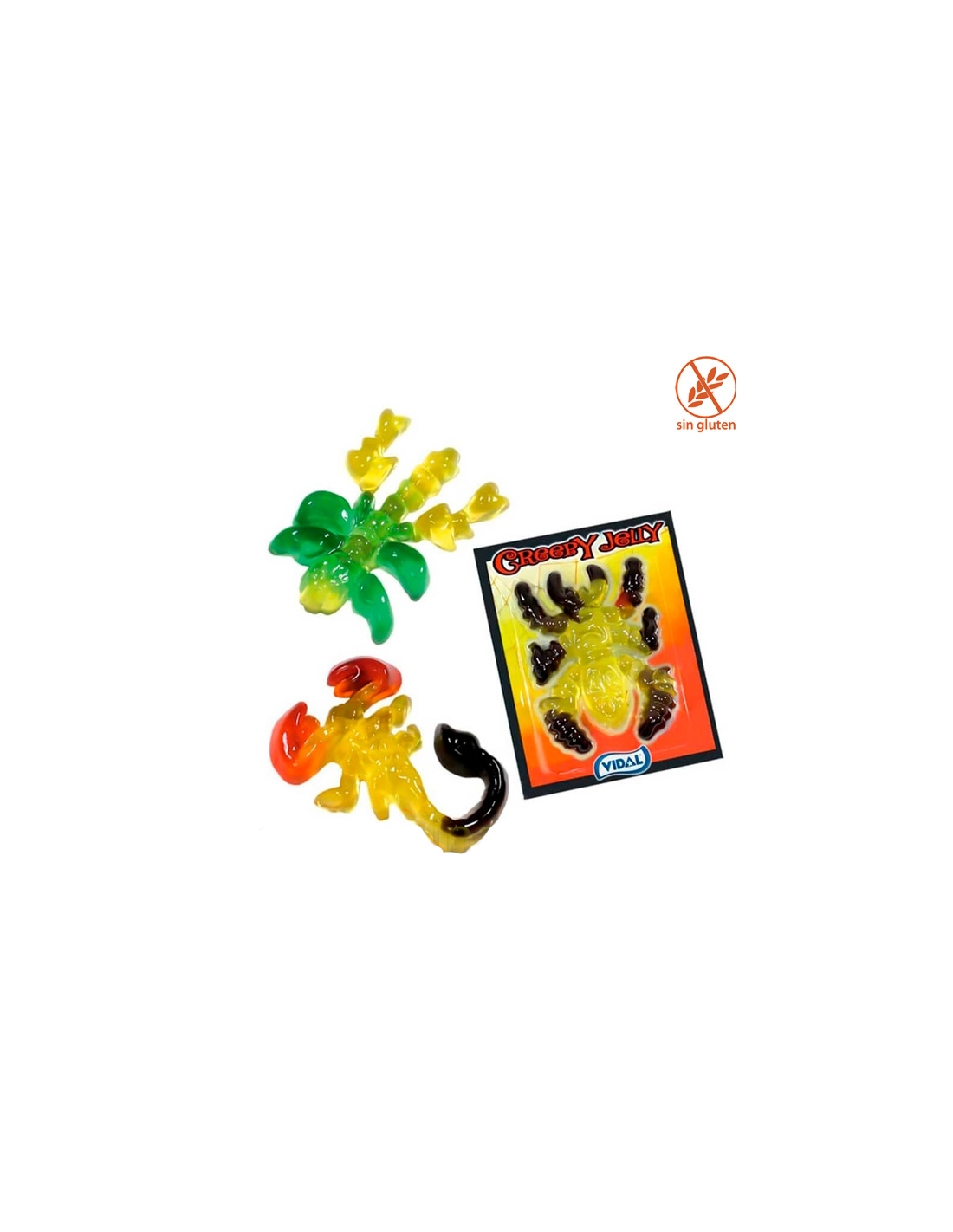 GELATINA CREEPY ENVUELTA 66uds VIDAL Disfruta de esta divertida y original pieza de Vidal Golosinas con una textura gelatinosa y colores vibrantes. Estas golosinas de gelatina en forma de insectos te cautivarán con su sabor intenso y su diseño único con forma de araña, escorpión, etc.