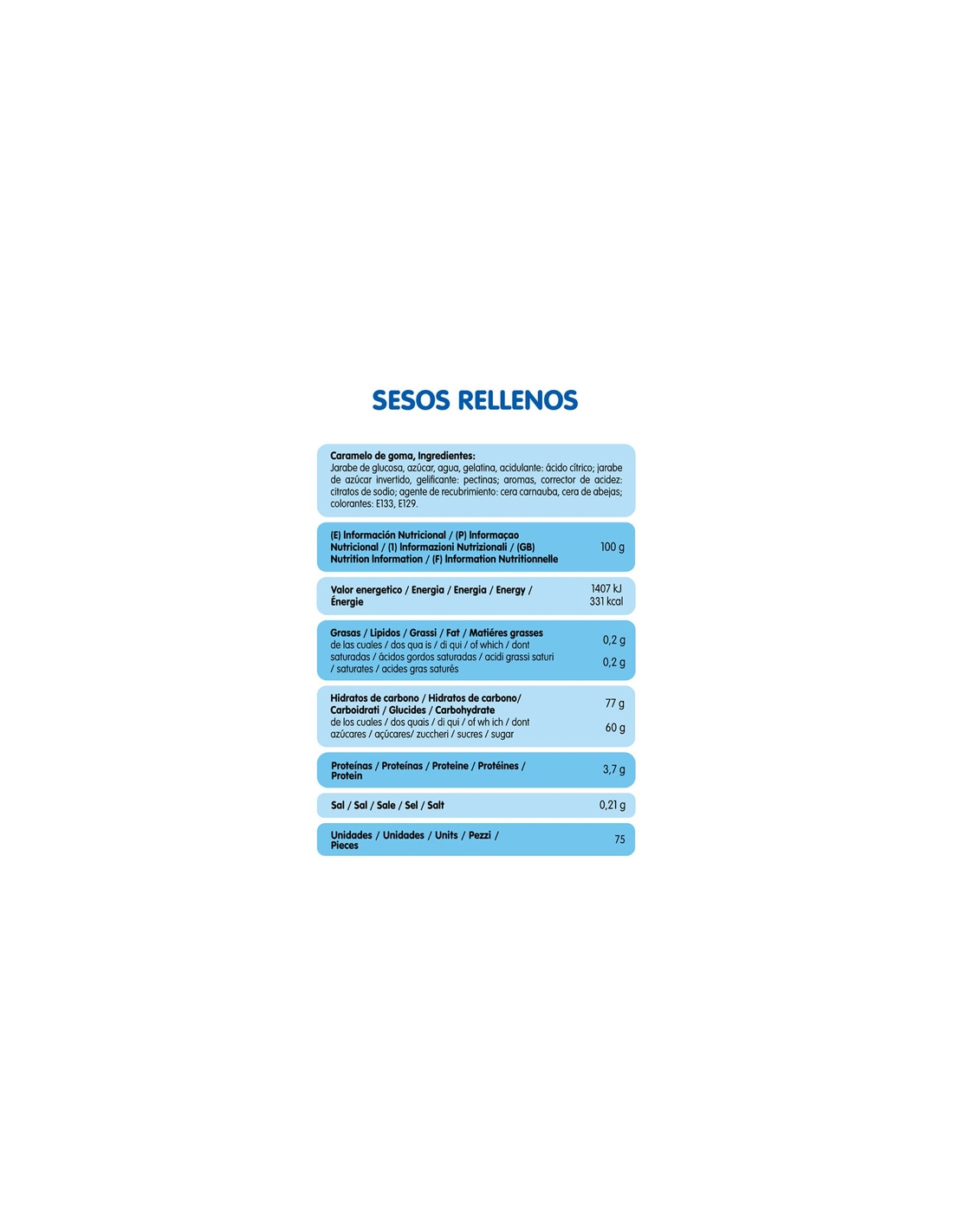 Ingredientes: jarabe de glucosa, azúcar, agua, gelatina; acidulante: ácido cítrico, ácido láctico; jarabe de azúcar invertido; gelificante: pectinas; aromas; corrector de acidez: citratos de sodio; aceites vegetales (palma); agente de recubrimiento: cera carnauba, cera de abejas; colorantes: E110, E122.