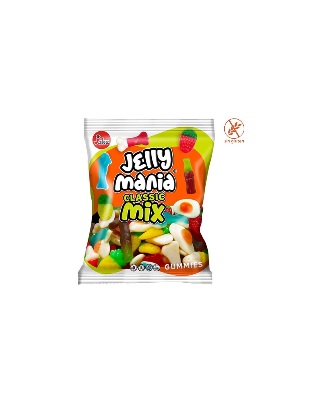 Jelly Mania Clasic mix brillo chuches surtidos 1Kg Jake Golosinas es un surtido de golosinas brillo con Fresas silvestres, Botellas Cola, Piñas, Tiburones, Huevos fritos y Huesos.