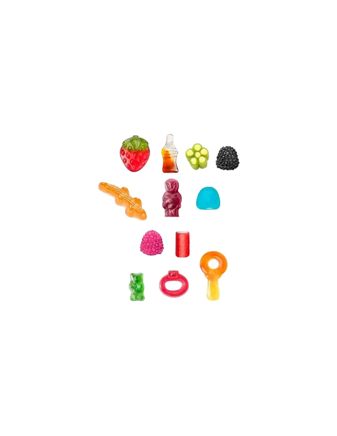 SURTIDO DE GOLOSINAS/ Jarabe de glucosa; azúcar; gelatina; harina de trigo; dextrosa; acidulante: ácido cítrico, ácido málico; correctores de acidez: citrato monosódico, malato ácido de sodio; almidón de maíz; almidón de trigo; grasa de palma; emulgente: monoglicéridos y diglicéridos de ácidos grasos; gelificante: agar; aroma; concentrados de frutas y plantas: espirulina, cártamo, manzana, rábano, grosella negra, baya de saúco, aronia, uva, zanahoria, hibisco, naranja, limón, mango, fruta de la pasión; extracto de baya de saúco; jarabe de caramelo; colorantes: curcumina, carbón vegetal, carotenos de plantas, luteína, antocianinas; agentes de recubrimiento: cera de abeja blanca y amarilla, cera de carnauba.