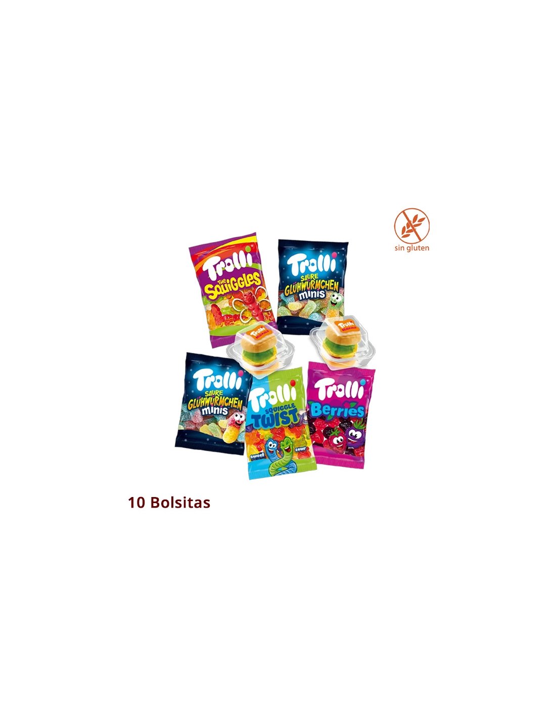 10 Bolsitas de goma Original Hits de Trolli 200gr son 10 uds como Bolsitas de goma como Gusanos pica, gusanos brillo, Moras brillo y mini burgers.