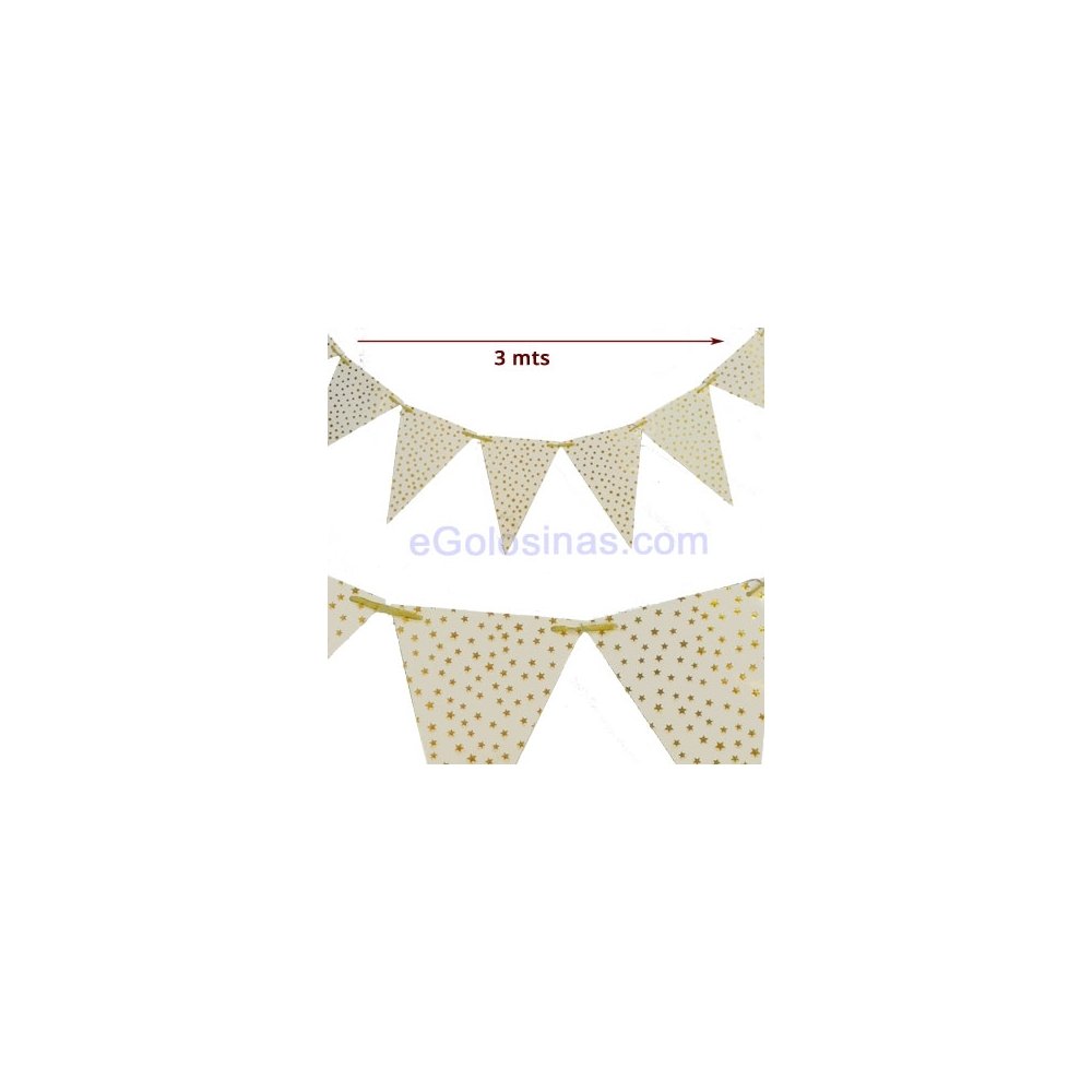 GUIRNALDA BANDERIN ESTRELLAS ORO 3mts es una guirnalda de cartón de 2 metros de largo con cinta dorada y banderines blancos con estrellas doradas de 28cm de alto y 19cm de ancho en la parte superior.