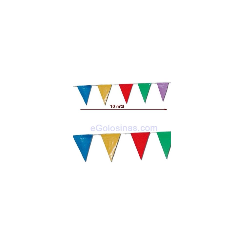 BANDERIN PLASTICO ARCO IRIS 10mts es una guirnalda de exterior de plástico con cada triángulo de un color.