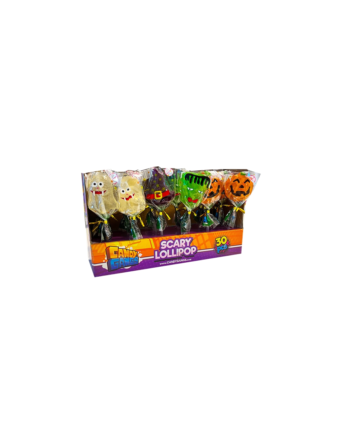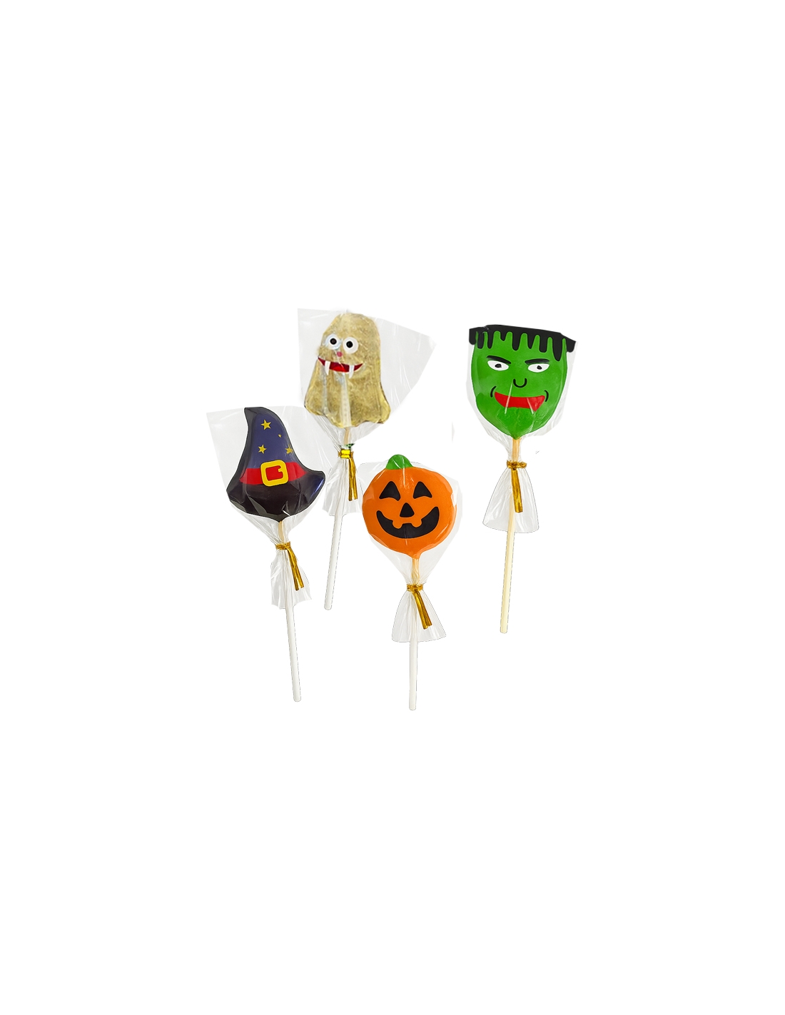 Piruletas Caramelo Halloween Scary Lollipop 30uds son piruletas de caramelo sabor frutas que van 10 de Calabaza de Halloween, 10 de Fantasma de caramelo, 5 Sombreros de bruja y 5 de Monstruos Franskenstein.