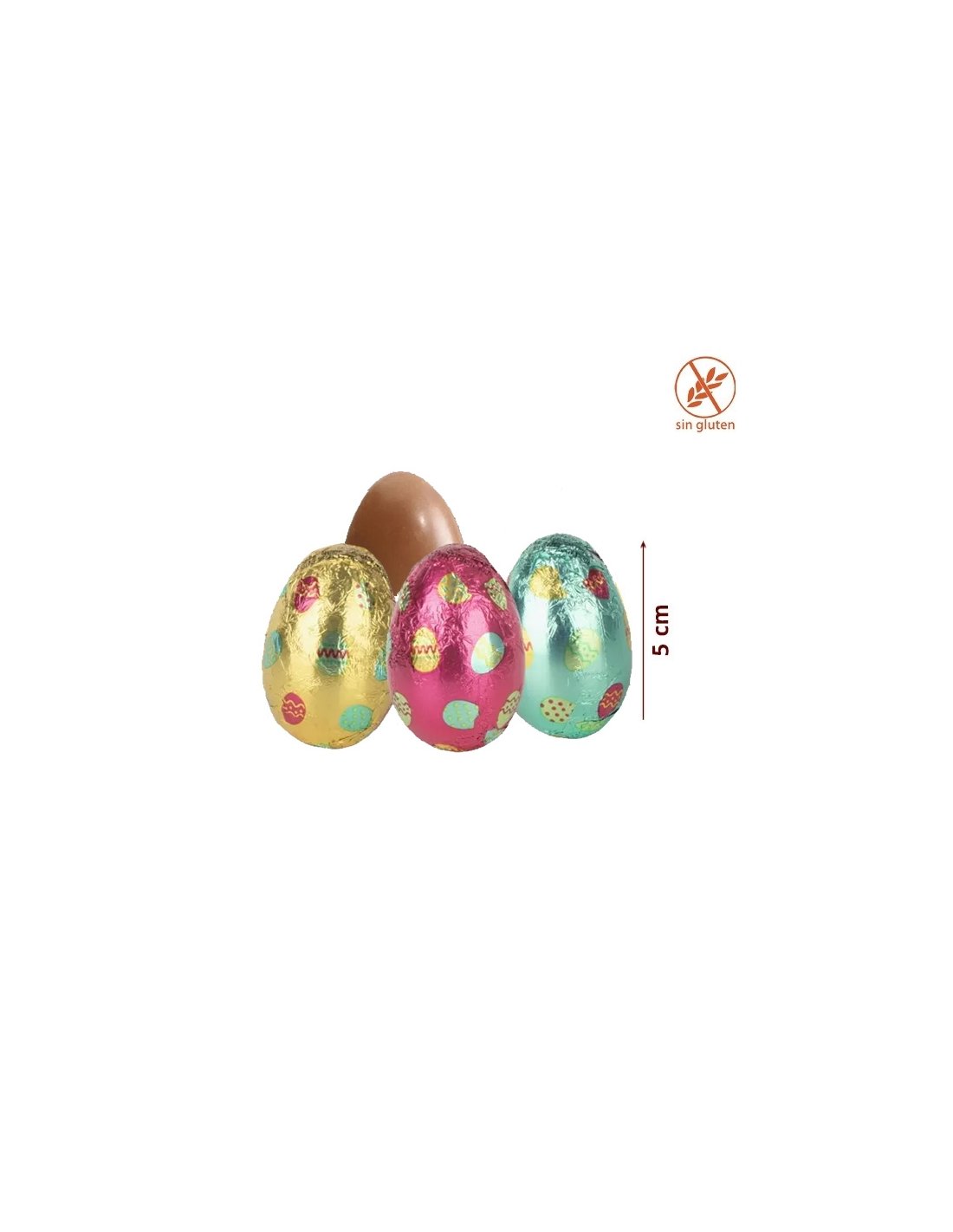 Es una huevo de chocolate de Pascua de 5 cm de alto vacío por dentro y envueltos con papel de aluminio de colores. Se vende caja de 40 huevos envueltos individualmente. Sin Gluten