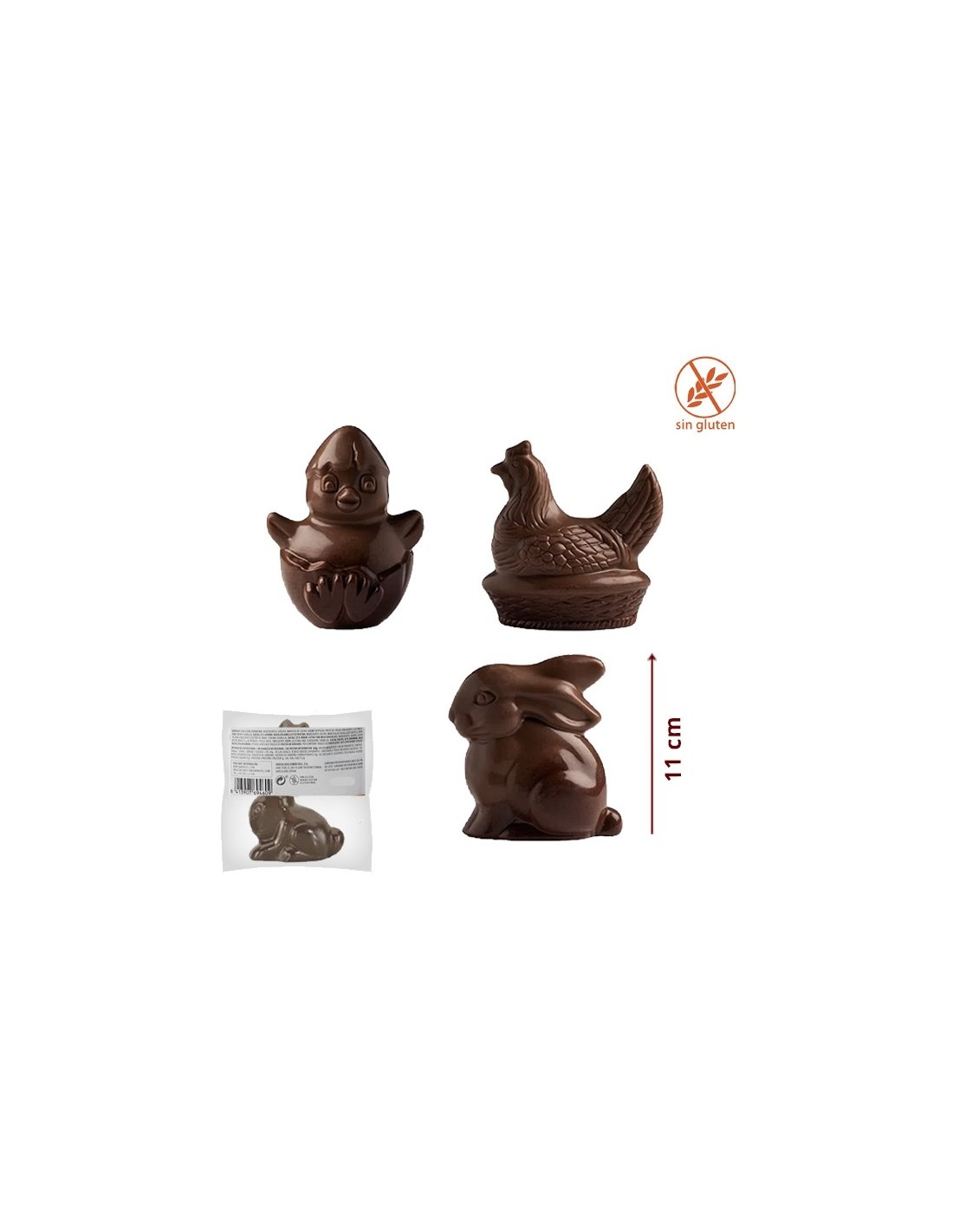 FIGURAS SURTIDAS DE CHOCOLATE son figuras surtidas de chocolate negro 50% con 3 opciones: pollito, gallina o conejo.