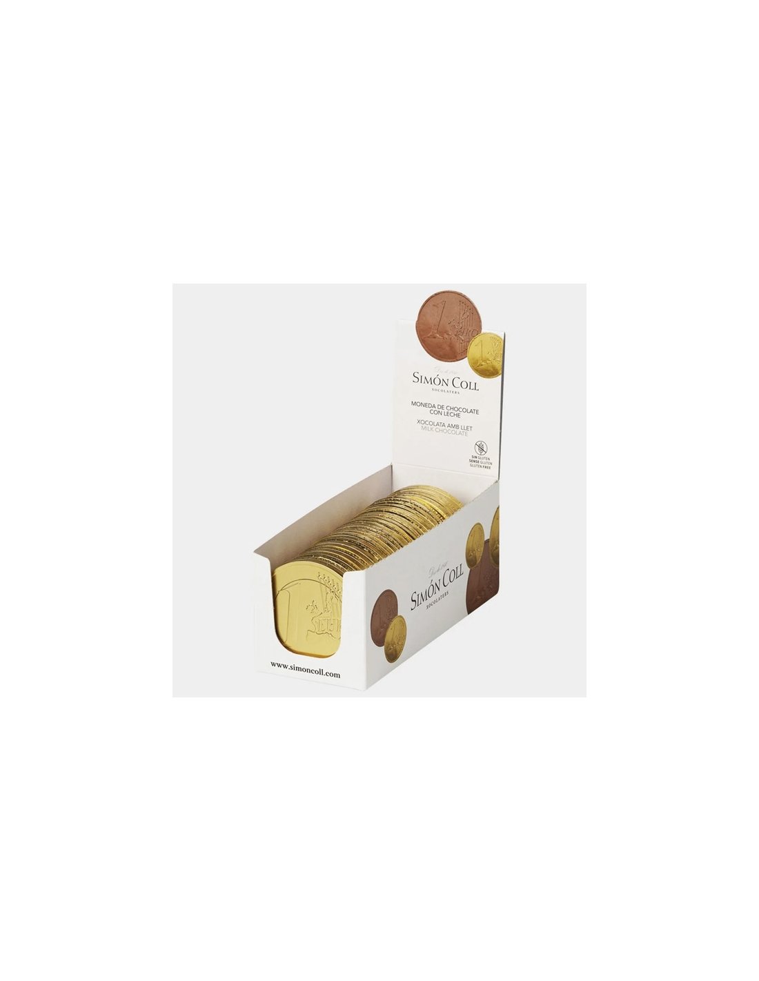 Todos las monedas de chocolate de Simón Coll vienen en una tarro expositor o caja expositora con los ingredientes y el gramaje de cada producto.