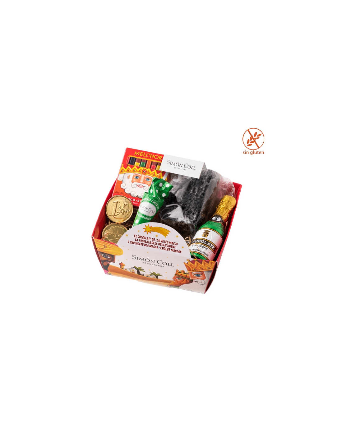 CESTA NAVIDAD 106gr SIMON COLL es una cesta de Navidad ideal para regalar con los mejores chocolates de Simon Coll con monedas de chocolate, Botella de chocolate, sombrillas de chocolate y lapices de chocolate. Se vende la unidad.
