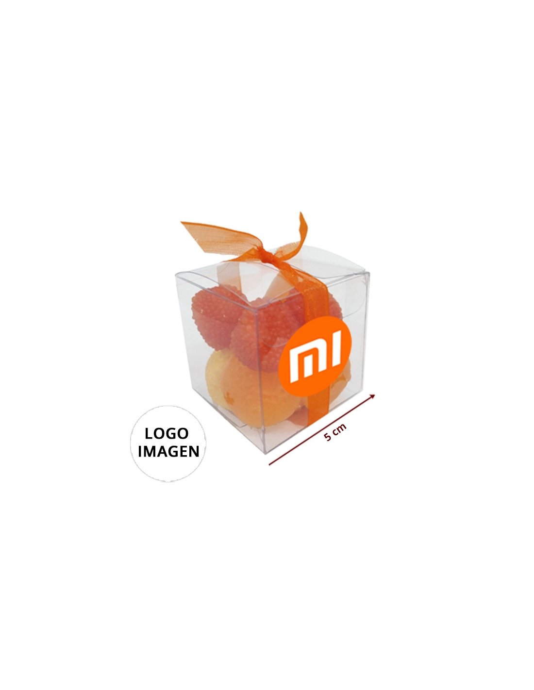 CAJA CHUCHES NARANJA 65gr con LOGO personalizado es una caja de pvc de 5x5x5cm con chuches naranjas nube y gomas. Cerradas con una cinta naranja. Toda la caja viene montada y etiquetada. La etiqueta mide 31mm de diámetro y sólo deben enviarnos la imagen en JPG en buena resolución a todo color. Son detalles de empresa para eventos, convenciones o un detalle de chuches para los empleados.