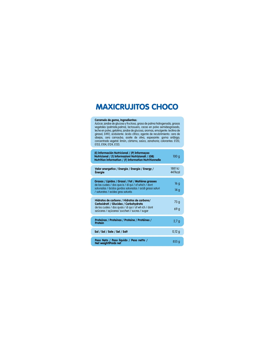Ingredientes: azúcar, jarabe de glucosa y fructosa, grasa de palma hidrogenada, grasas vegetales (palmiste,palma), lactosuero, cacao en polvo semidesgrasado, leche en polvo, gelatina, jarabe de glucosa, emulgente: lecitina de girasol, E492; aromas, acidulante: ácido cítrico; agente de recubrimiento: cera de abejas, cera carnauba; aceite de oliva, espesante: goma arábiga; concentrado vegetal: limón, cártamo, saúco, zanahoria; colorantes: E120, E153, E104, E124, E133.