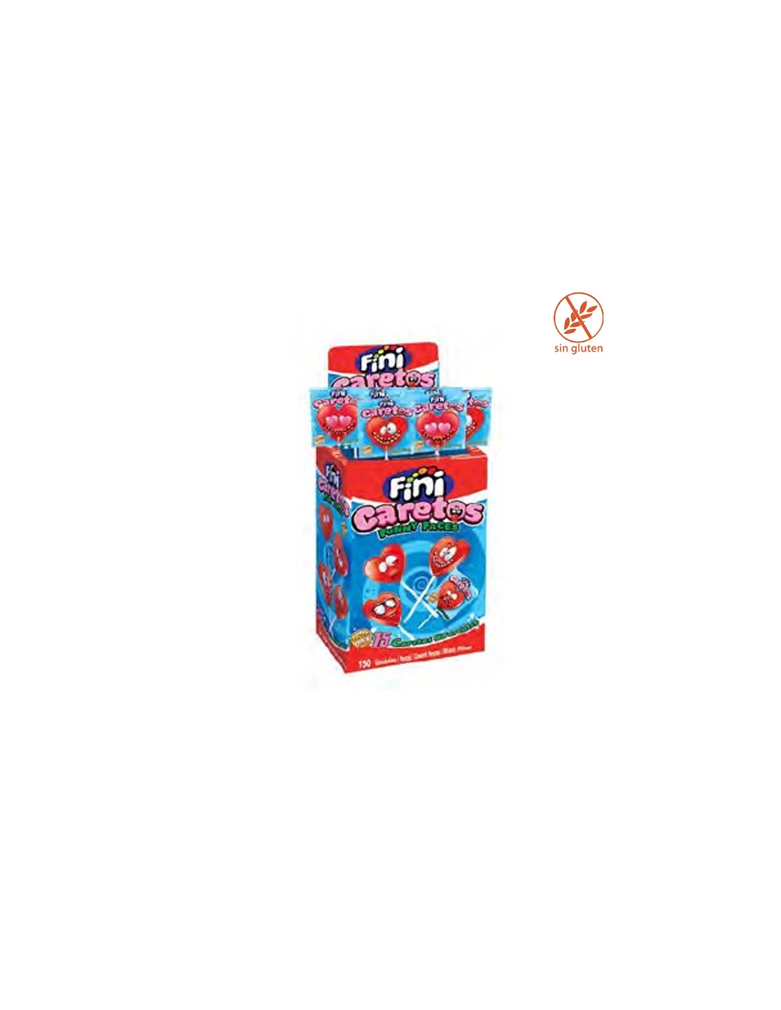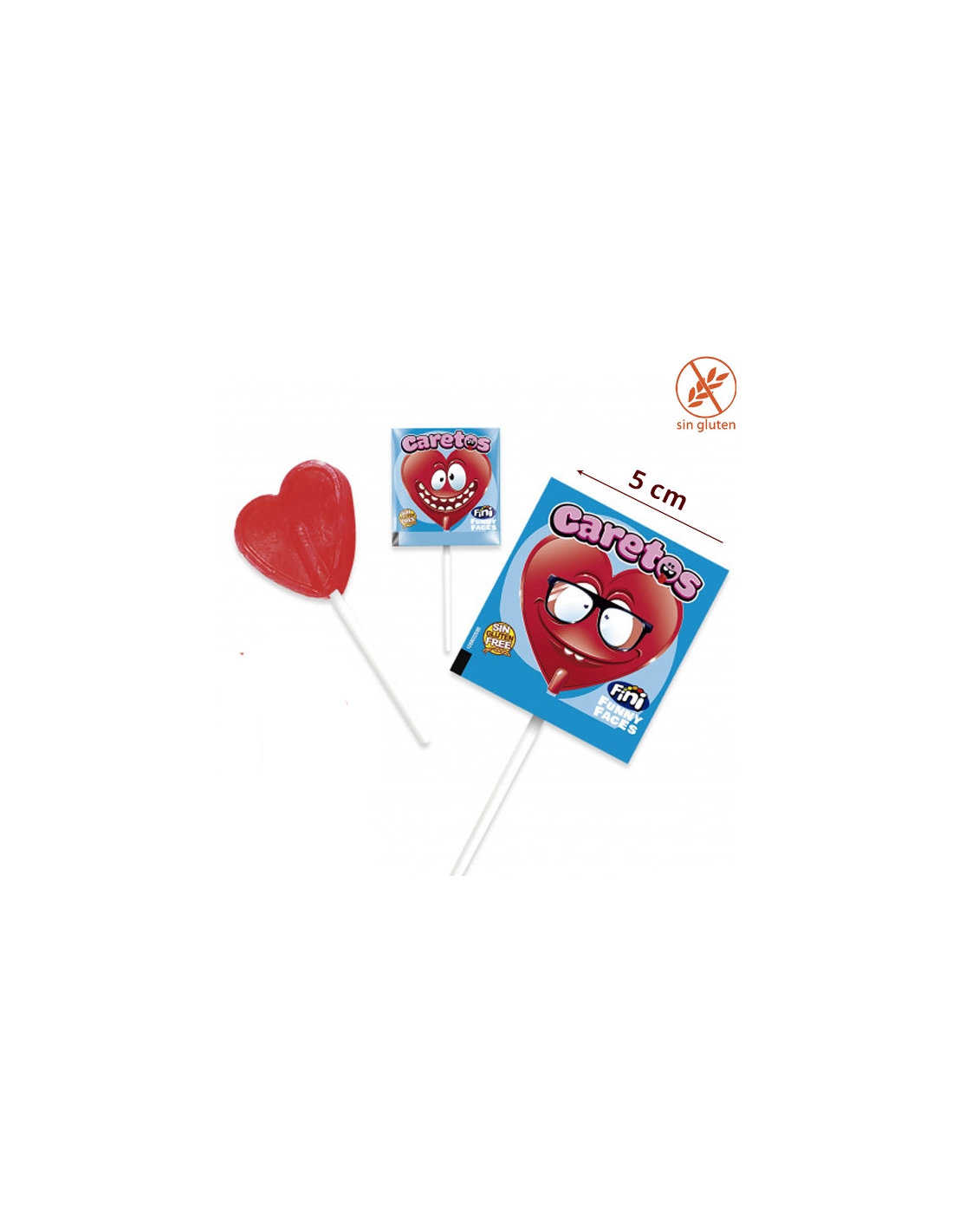 PIRULETA CARETOS FRESA son piruletas con sabor a fresa envueltas con divertidas caras surtidas como Piratas, Pintores, caras sonrientes, caras asustadas, etc. S venden en cajas expositoras de 170uds. Sin Gluten