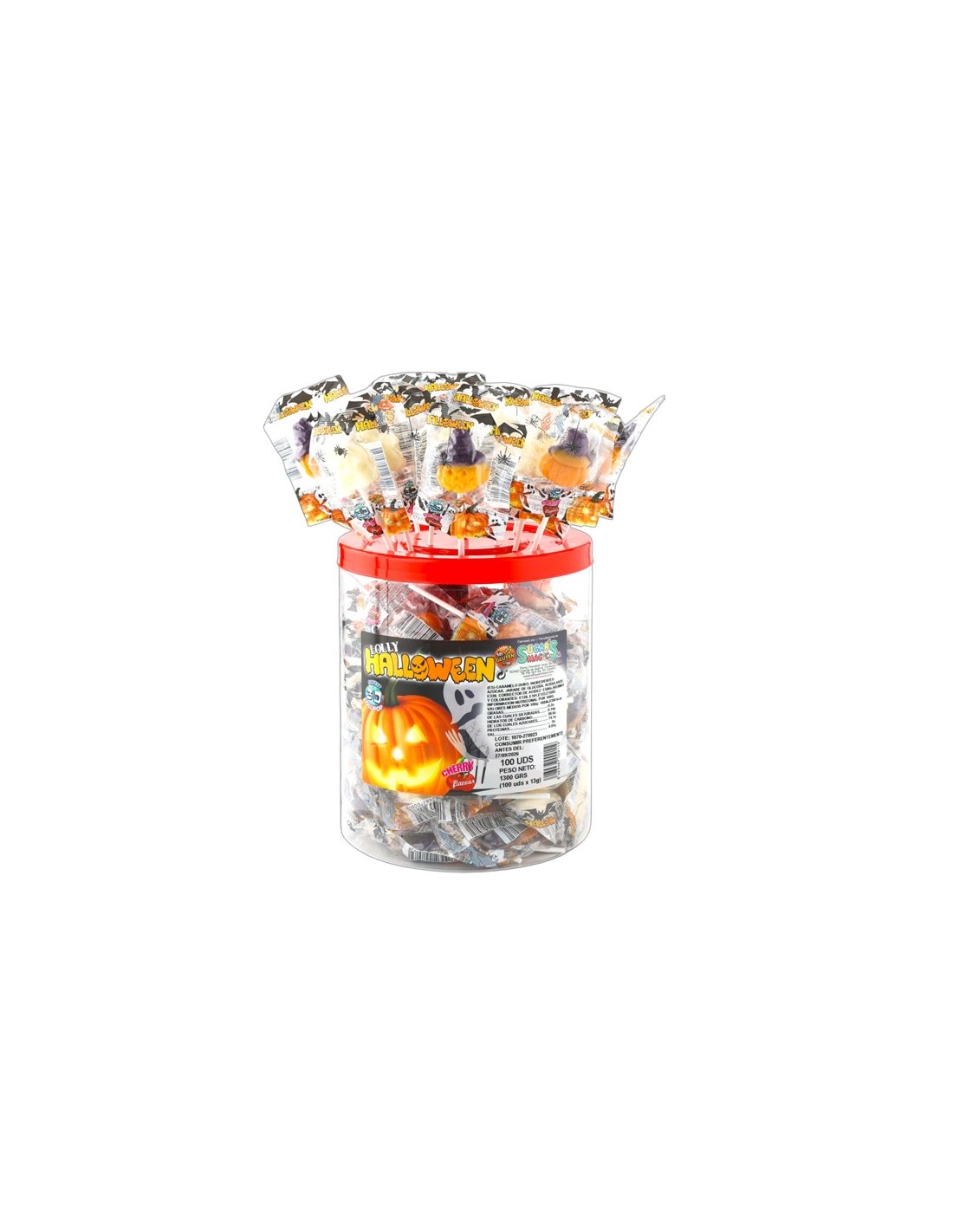 Piruleta Calabaza Halloween y Fantasma 13gr 100uds Sugars Magic son piruletas 3D de Cereza con forma de Calabaza de Halloween y Fantasma. Van envueltas individualmente.