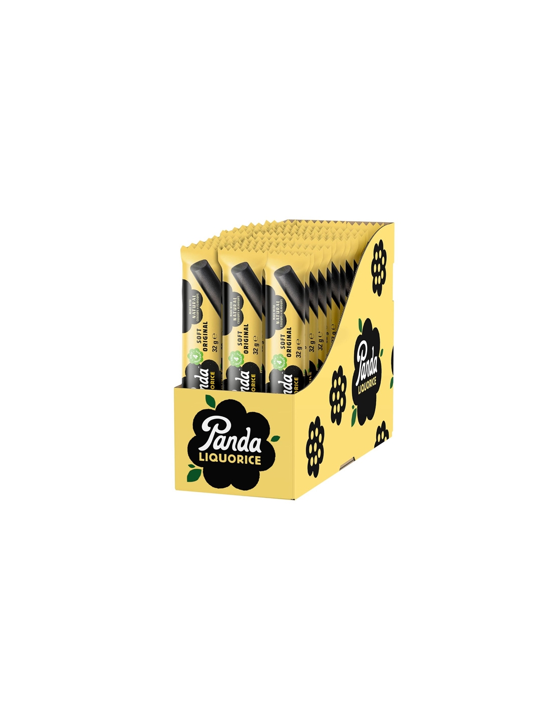 PANDA ALL NATURAL 36uds 32gr PANDA es la regaliz clásica blanda todo natural del panda envuelta de 32 gr. Se vende en cajas de 36 unidades.