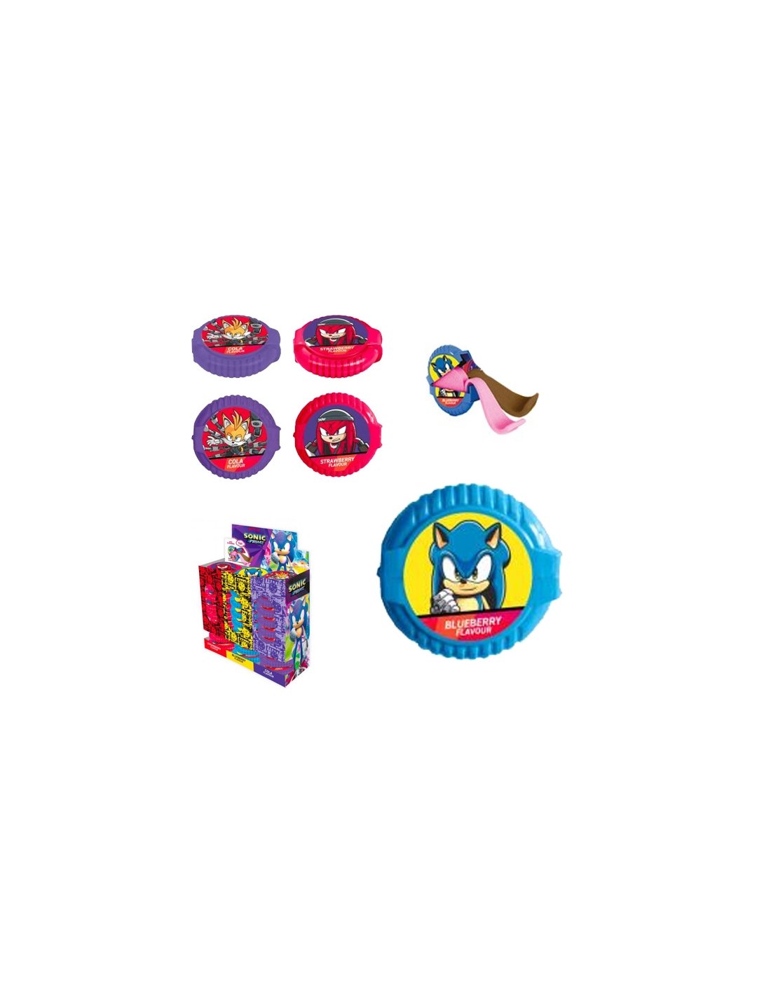 Chicle Roll SONIC 24uds DISGO son chicle extralargos de 3 sabores: cola, fresa y arándano. Se venden en caja expositora de 24uds.
