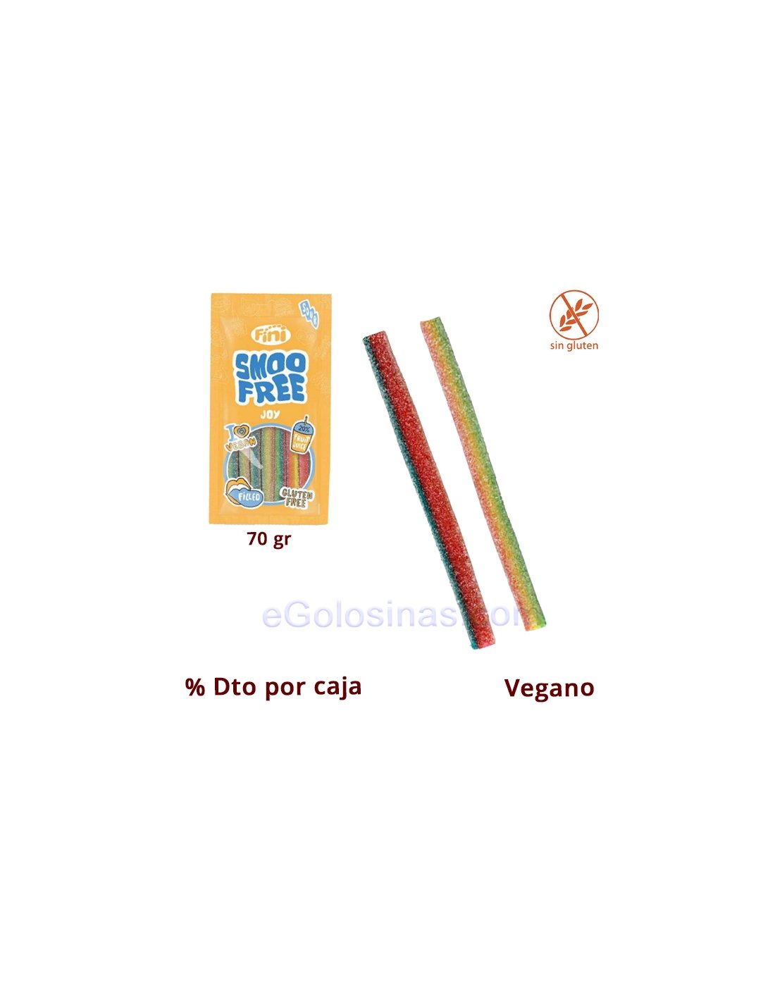 SMOOFREE JOY RELLEPICA 70gr Fini Golosinas son bolsitas de 70gr de regalices rellenitos multicolor con pica. Son aptos para veganos y no contienen gluten. Se venden bolsitas sueltas o con descuento en packs.