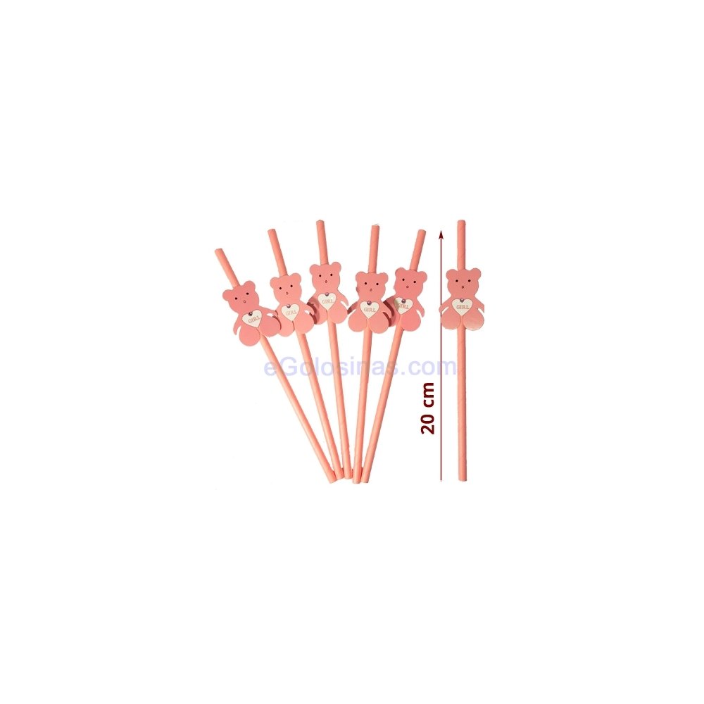 6 PAJITAS DECORADAS OSO ROSAS BEBE son cañitas de papel rosas para decorar tu Mesa Dulce Bautizo o Baby Showers. Miden 20cm y llevan un osito con una perlita de decoración.