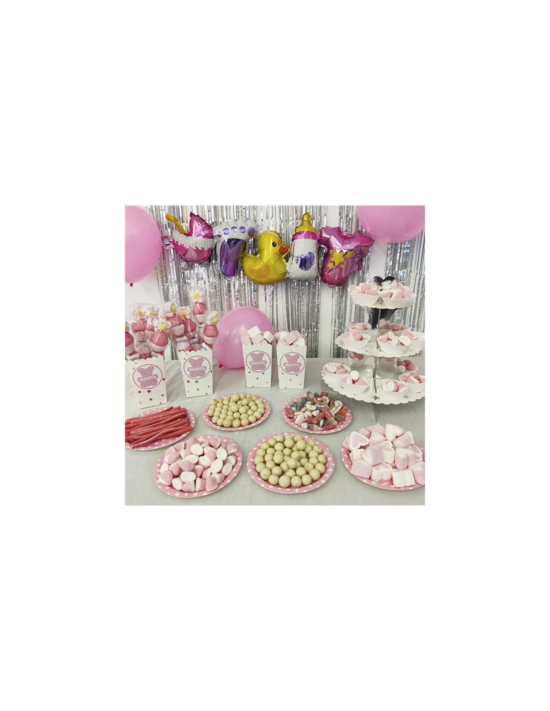 Pack de Mesas Chuches para Bautizo Rosa que contiene TODO lo que se ve en la imagen chuches, bols y globos, excepto la cortina y el mantel.