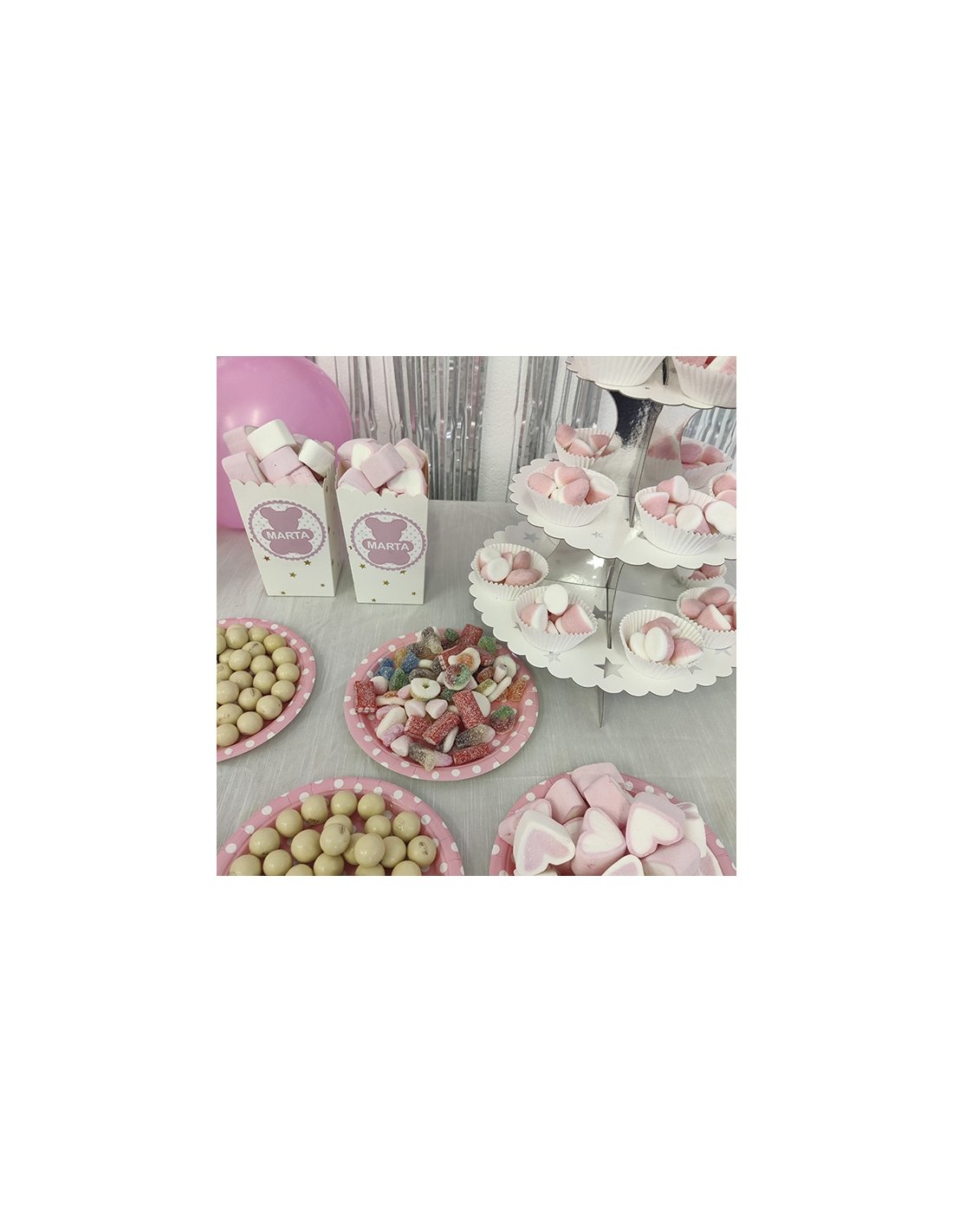 Mesa Dulce de Bautizo para Fiesta personalizada con etiqueta es una Mesa dulce decorada con golosinas rosas y blancas. Con este pack de fácil montaje crearás tu mesa Dulce perfecta para un Bautizo (3.5Kg aprox) Contiene TODO lo que se ve en la imagen chuches, bols y globos, excepto la cortina y el mantel.
