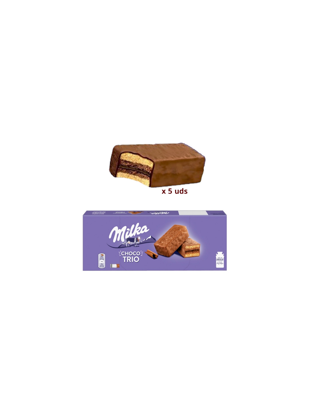 Caja Bizcocho Milka Choco Trío 150gr 1ud (5 trozos) son 5 trozos envueltos individualmente de tierno bizcocho relleno con cacao intenso y cubierto de chocolate con leche de la marca Milka