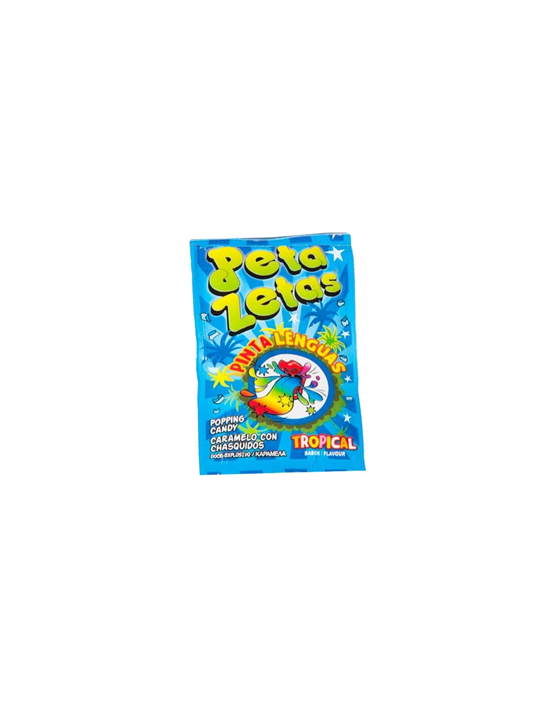 PETA ZETAS PINTALENGUAS son los famosos Peta Zetas con caramelos con chasquido en tu boca y con sabor TROPICAL. Se vende envueltos individualmente en una caja de 50 unidades.