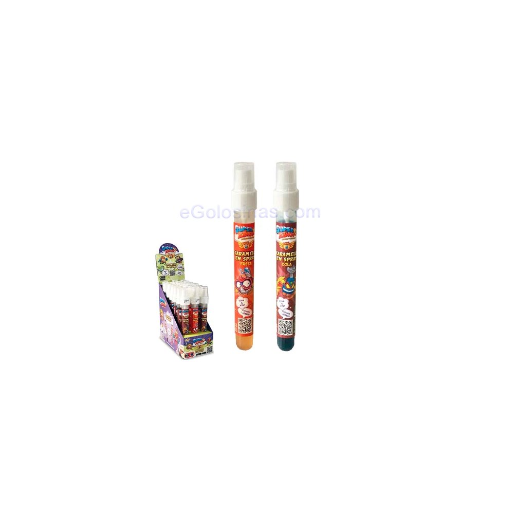 SPRAY GOLOSINA SUPERZINGS 18uds son 2 tipos de spray de golosina líquida. Los sabores son cola y fresa. Se venden 18 sprays.