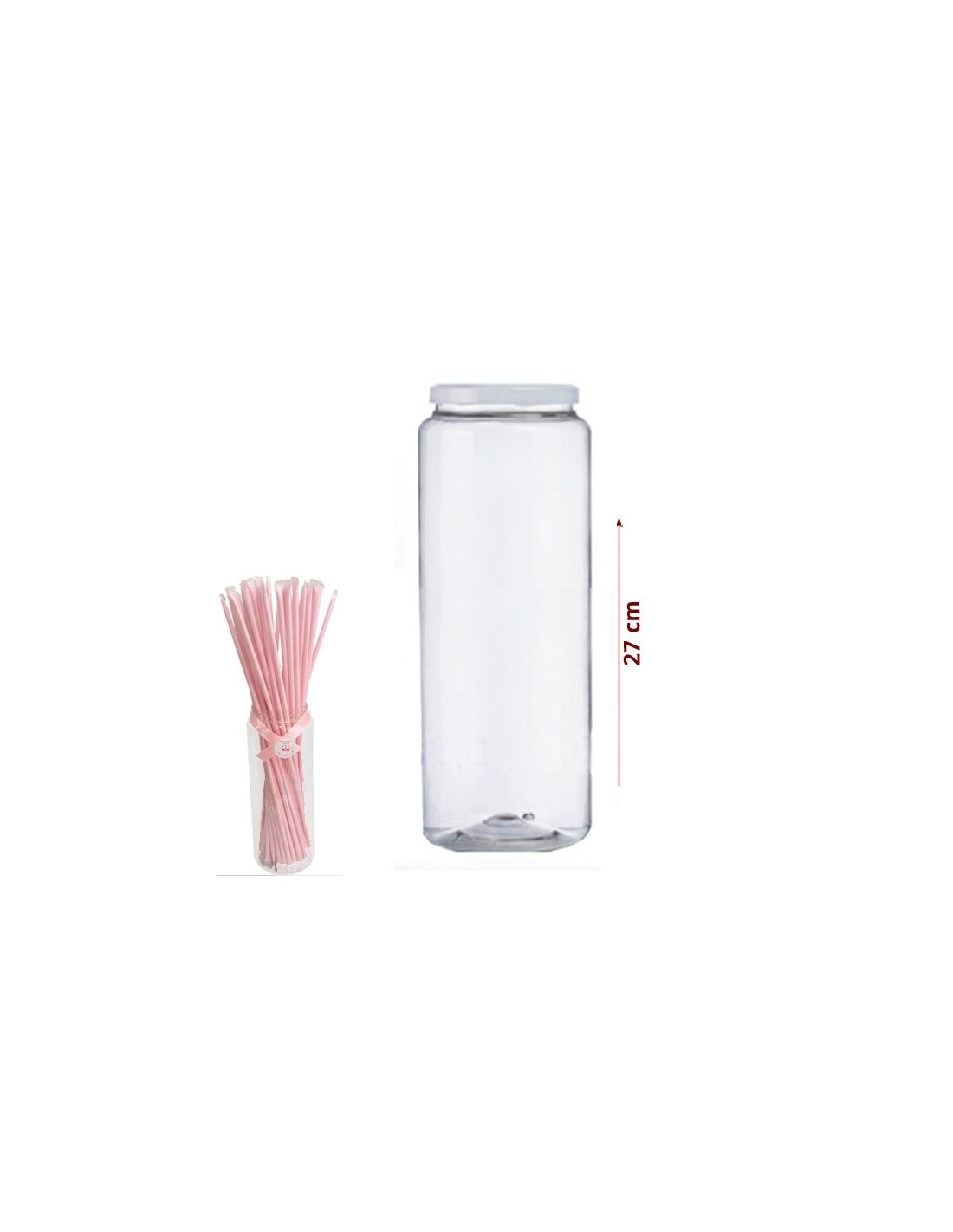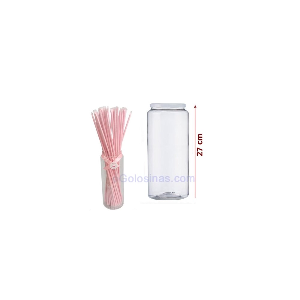 TARRO PARA CAÑAS PICAPICA PLASTICO PET Frasco transparente de plástico pet. Capacidad 2100cc, 10cm de ancho y 27cm de altura con tapa metálica blanca. Ideal para detalles de chuches. NO INCLUYE LAS CAÑAS PICA PICA