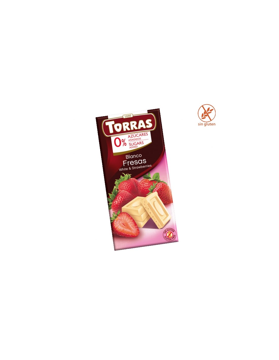 TABLETA CHOCO BLANCO con FRESA 75gr TORRAS sin azúcares añadidos. INGREDIENTES: Edulcorante (maltitol), manteca de cacao, leche en polvo, inulina, fresa liofilizada (2%), emulgente (lecitina de soja) y aromas (fresa y vainillina). Puede contener trazas de frutos secos. Contiene azúcares naturalmente presentes. Un consumo excesivo puede tener efectos laxantes.