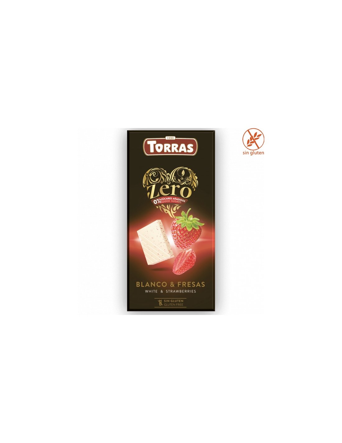 TABLETA CHOCO ZERO BLANCO FRESA 125gr TORRAS es una tableta de chocolate sin gluten y sin azúcares añadidos.
