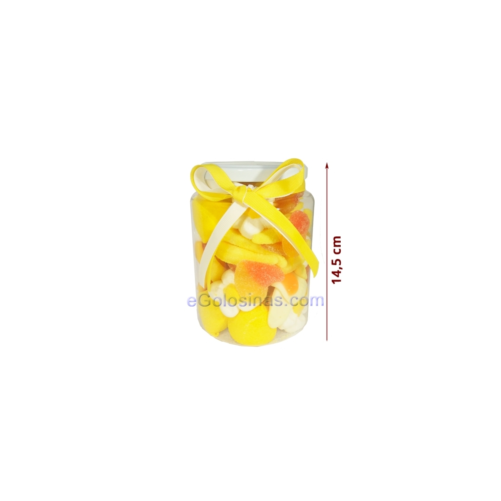 TARRO CHUCHES CHUCHES SURTIDAS AMARILLO es un tarro con un surtido de goma, regaliz y nubes AMARILLO con toques blancos de 700gr. Es un tarro ideal para regalar. Mide 14.5cm de alto aprox y 10.5cm de ancho. Bolsas surtidas de chuches de goma ideales para tu fiesta de Cumpleaños o para rellenar bols con chuches en una boda. Todas las bolsas vienen envasadas directas de fábrica por lo que conservan una calidad fresca y mantienen frescura durante tiempo.