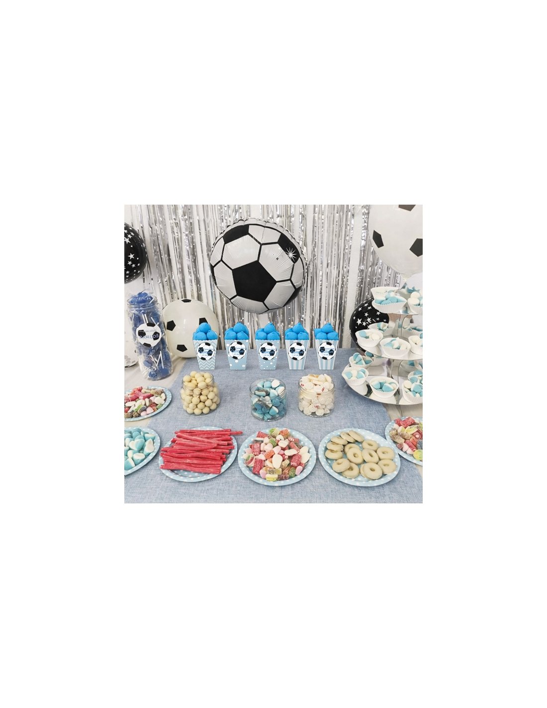 Pack de Mesas Chuches Azul de Fútbol que contiene TODO lo que se ve en la imagen chuches, bols y globos, excepto la cortina y el mantel.